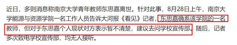 8月28日上午,有媒体联系了南京大学能源与资源学院。该学院的工作人员告诉媒体东思嘉老师的确是该学院的一名教师,但对东思嘉个人现状暂不清楚,建议媒体去问学校的宣传部。