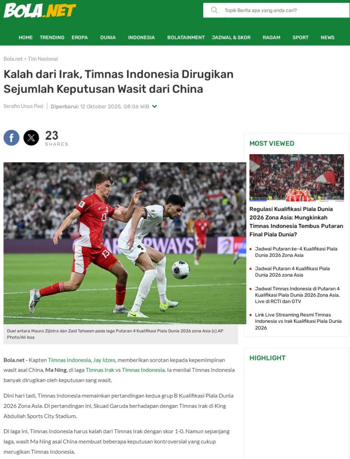 赛后印尼媒体BOLA撰文称“印尼国家队因中国裁判的决定蒙受损失”,文中指出“来自中国的裁判马宁做出了几项具有争议性的判罚,对印尼国家队造成了相当大的不利影响。”印尼队长伊泽斯赛后接受采访时也表示:“我们试图尊重裁判,尽管他们做出的判罚对我们不利,但我们仍然必须尊重他们。”